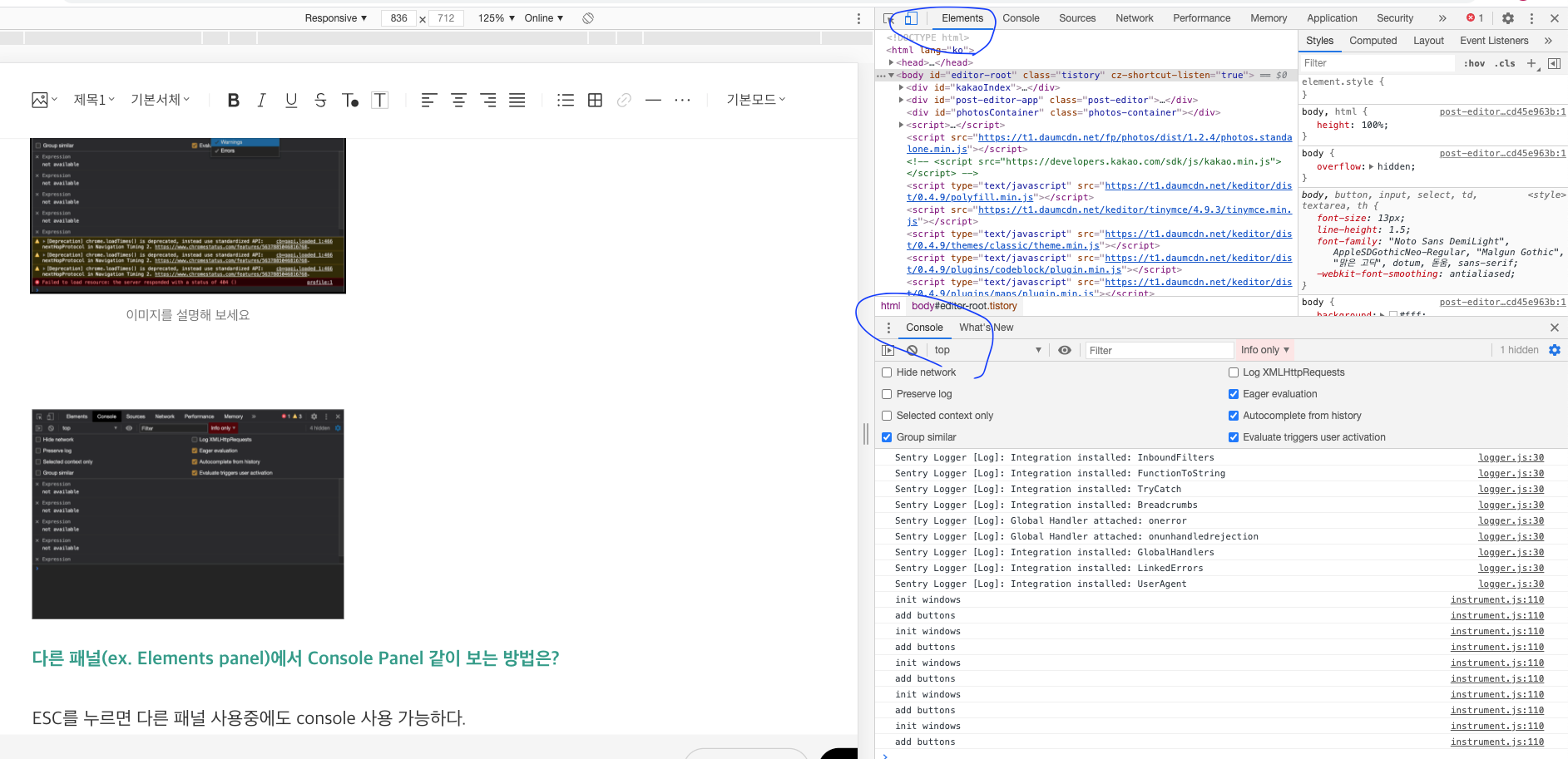 다른 패널(ex. Elements panel)에서 Console Panel 같이 보는 방법은?