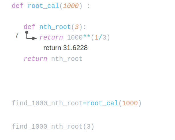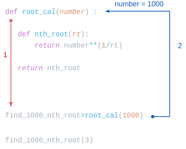 def root_cal(number) : def nth_root(rt): return number**(rt) return nth_root find_1000_nth_root=root_cal(1000) print(find_1000_nth_root(2)) # 1000 * 1000 print(find_1000_nth_root(3)) # 1000 * 1000 * 1000