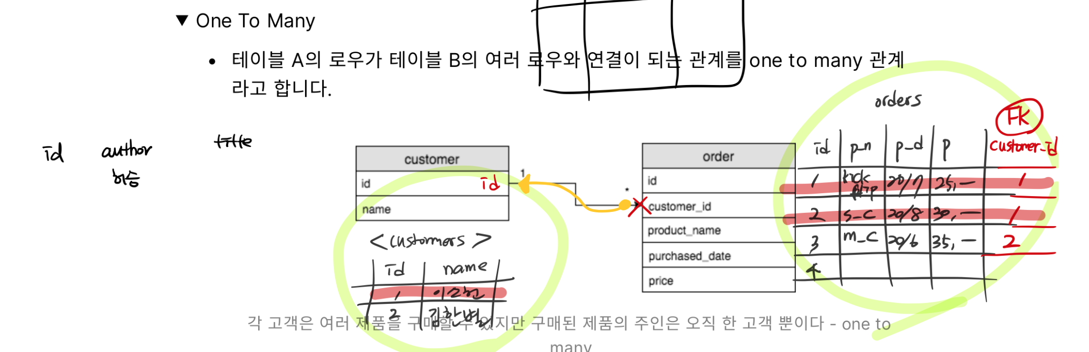 이때 고객 테이블과 오더 테이블은 one to many 관계를 갖는다.