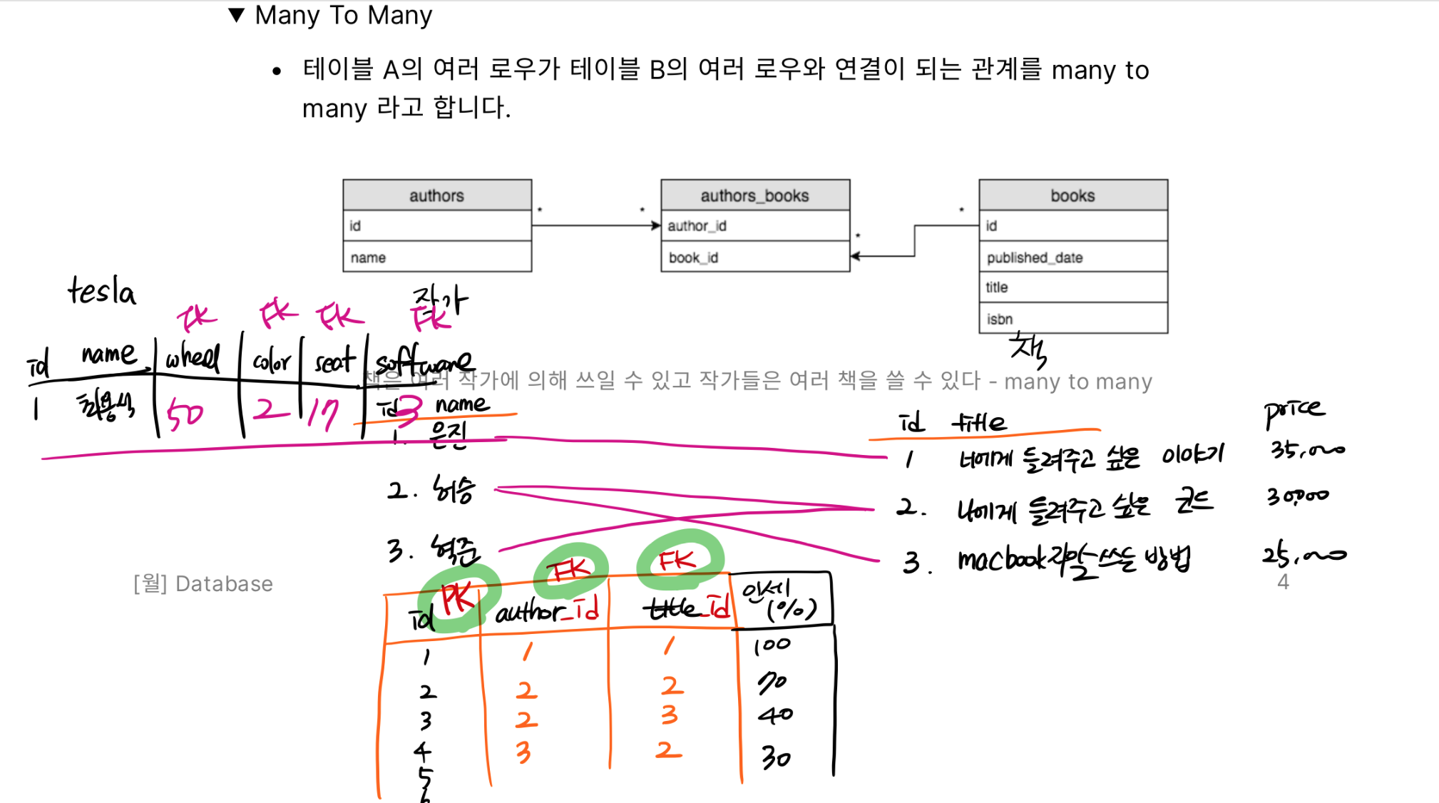 따라서 작가와 책 테이블의 중간(피벗테이블)을 만들어 각 테이블의 PK를