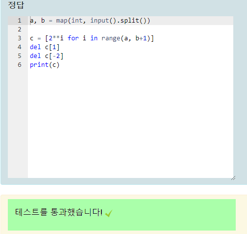 표준 입력으로 정수 두 개가 입력됩니다(첫 번째 입력 값의 범위는 1~20, 두 번째 입력 값의 범위는 10~30이며 첫 번째 입력 값은 두 번째 입력 값보다 항상 작습니다). 첫 번째 정수부터 두 번째 정수까지를 지수로 하는 2의 거듭제곱 리스트를 출력하는 프로그램을 만드세요(input에서 안내 문자열은 출력하지 않아야 합니다). 단, 리스트의 두 번째 요소와 뒤에서 두 번째 요소는 삭제한 뒤 출력하세요. 출력 결과는 리스트 형태라야 합니다.