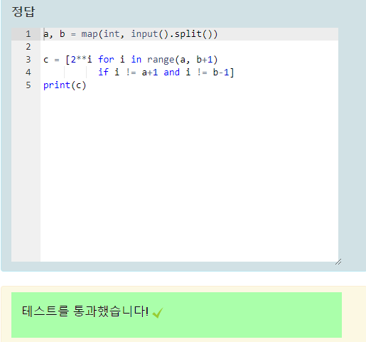 c = [2**i for i in range(a, b+1)