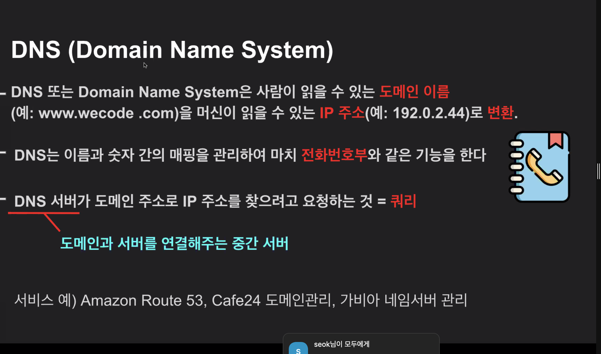 사람이 읽을 수 있는 도메인 이름을 -> 기계가 읽을 수 있는 IP주소로 변환시켜준다.