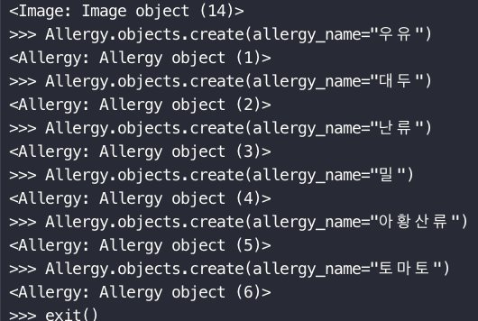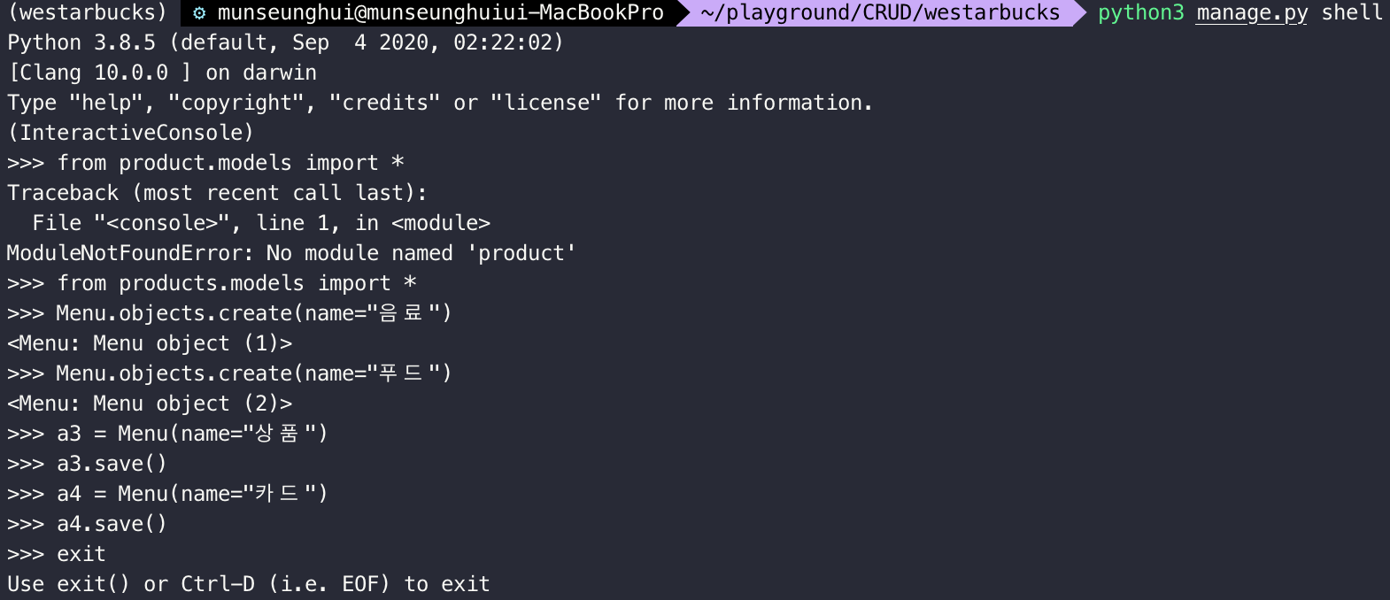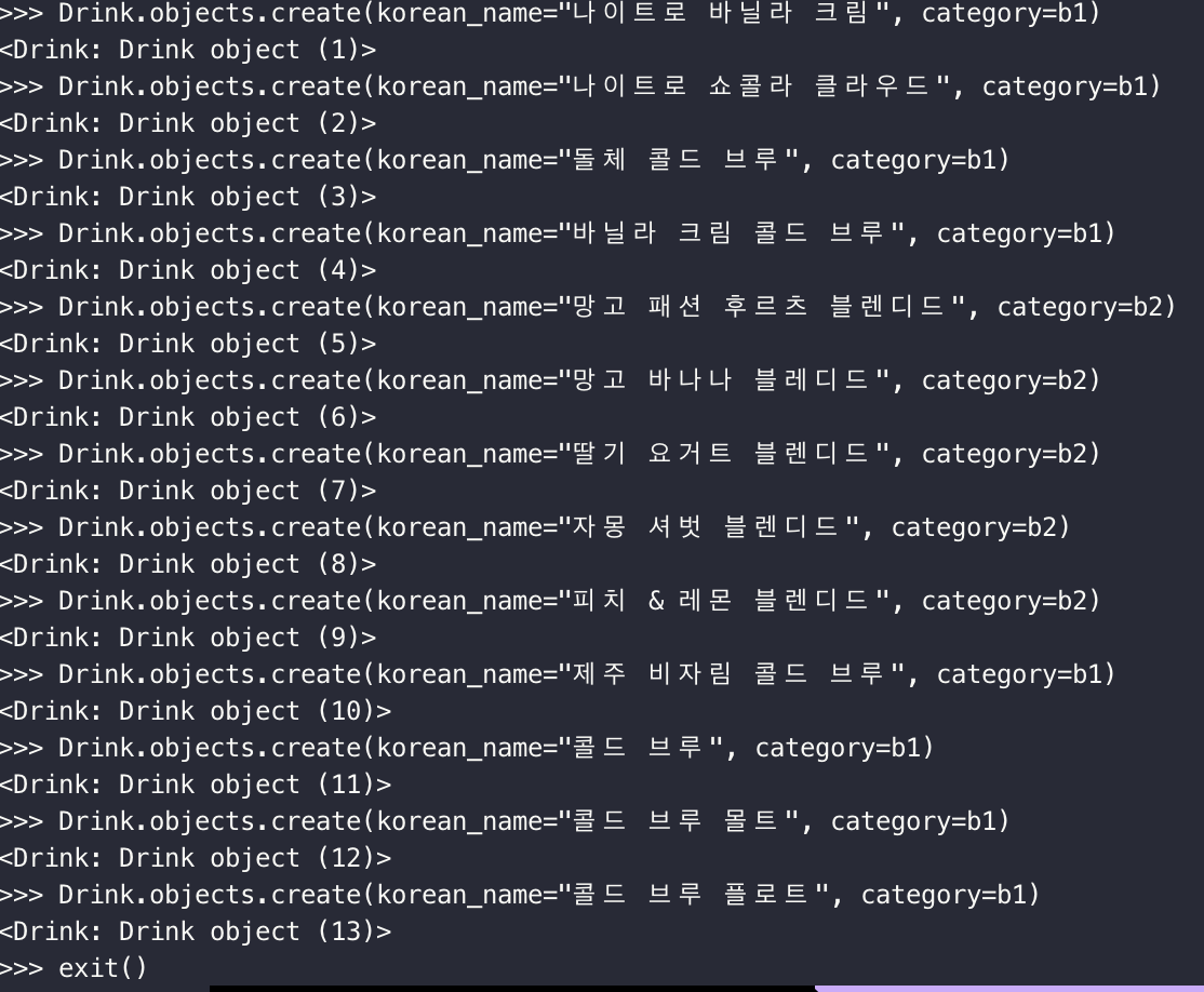 >>> Menu.objects.create(name="음료") >>> Menu.objects.create(name="음료") >>> a3 = Menu(name="상품") >>> a3.save() >>> a4 = Menu(name="카드") >>> a4.save()