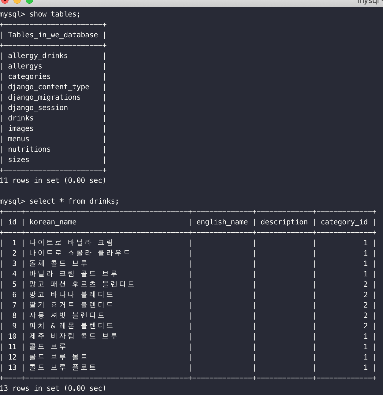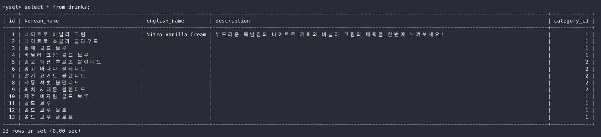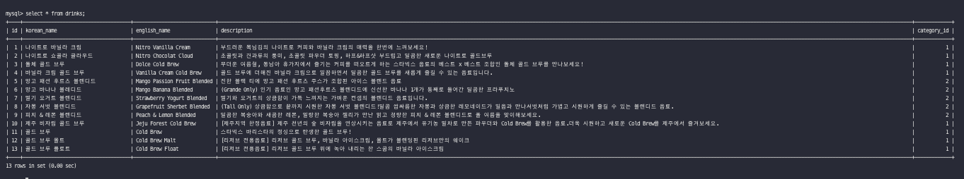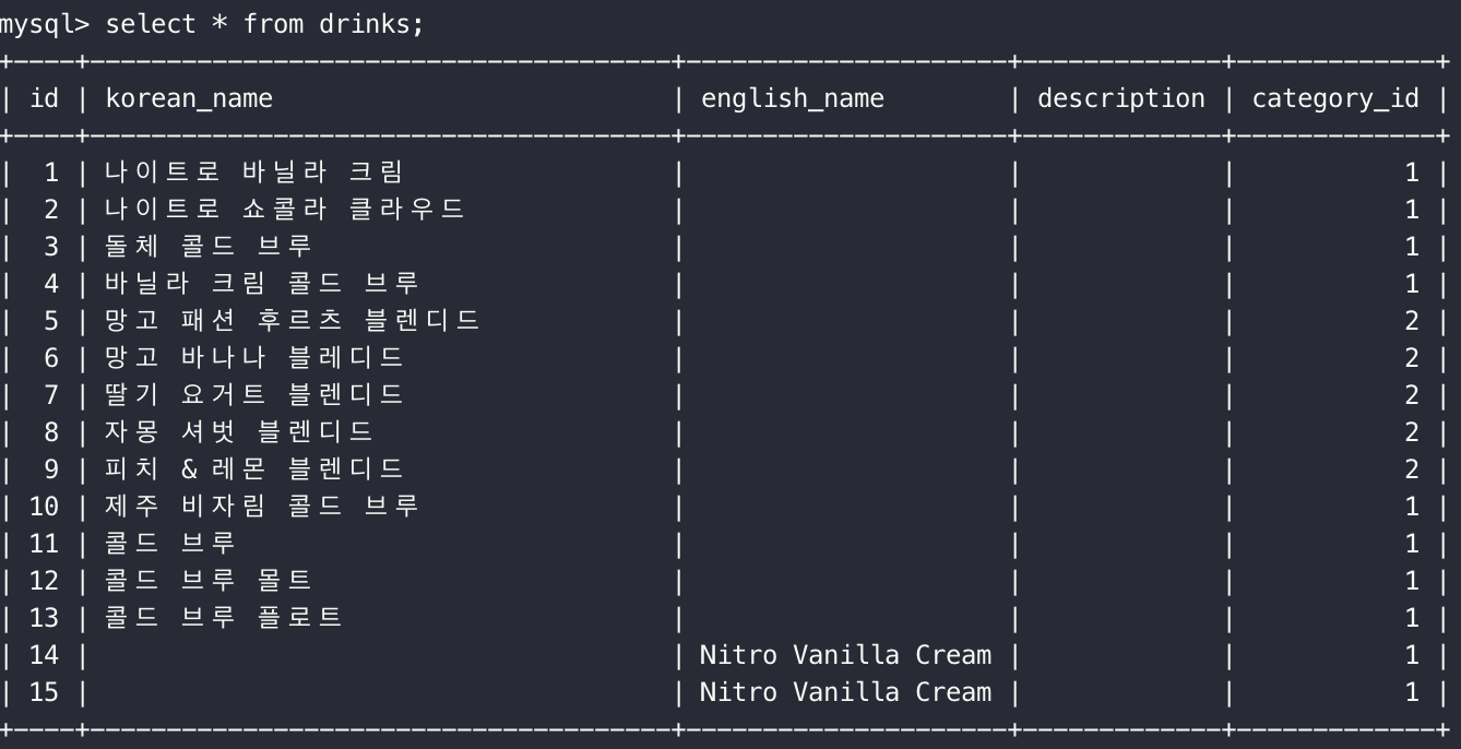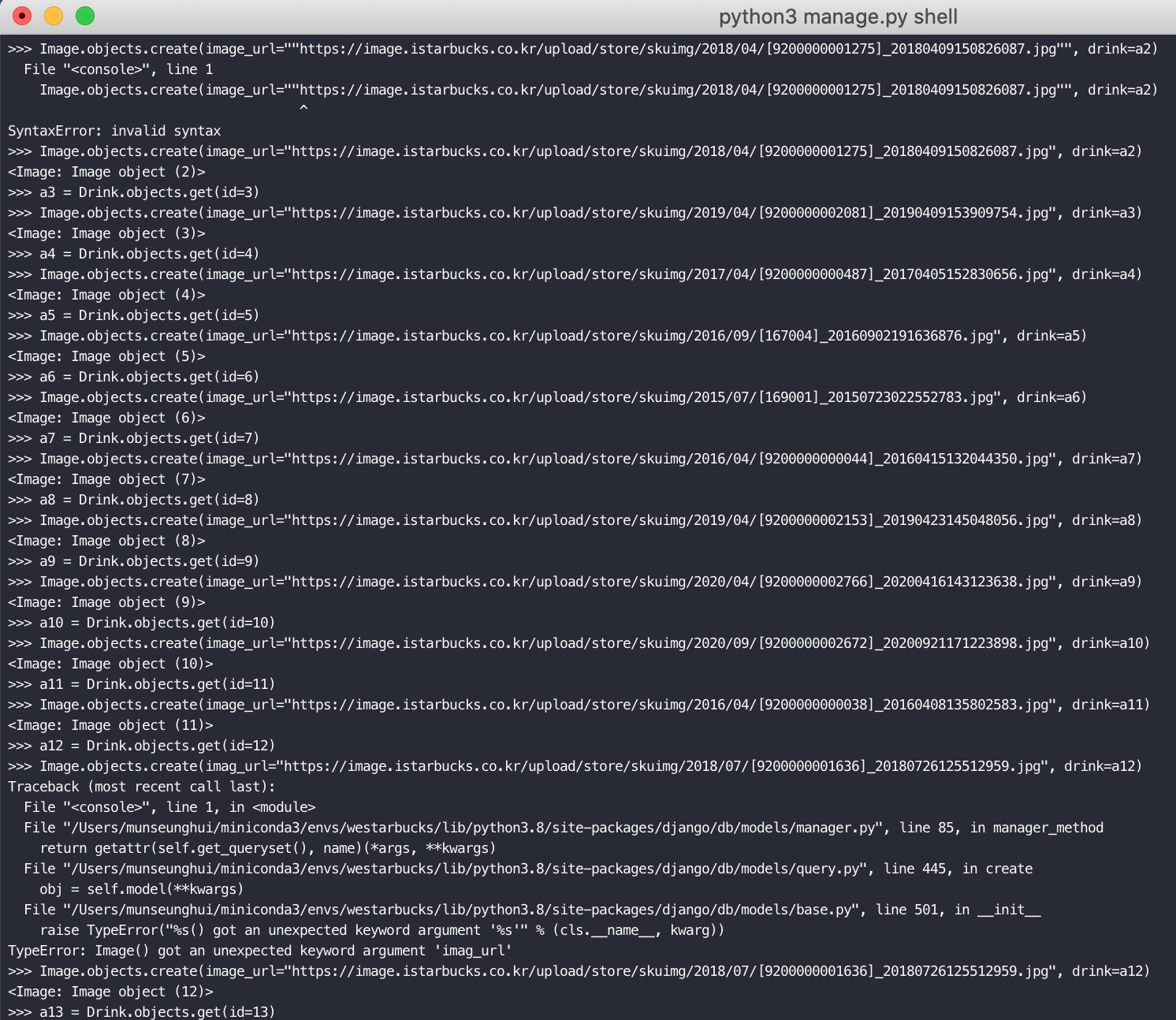 >>> a1 = Drink.objects.get(id=1) >>> a1.english_name = "Nitro Vanilla Cream" >>> a1.description = "부드러운 목넘김의 나이트로 커피와 바닐라 크림의 매력을 한번에 느껴보세요!" >>> a1.save()위와 같은 방법으로 하나 하나 정성스럽게 넣어주자.