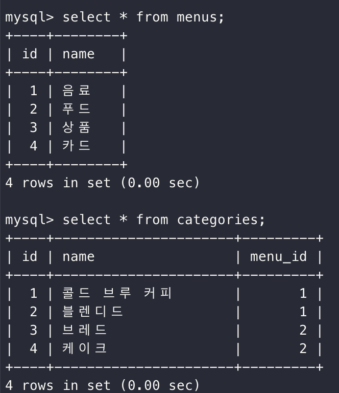 >>> a1 = Menu(name="음료") >>> a2 = Menu(name="푸드") >>> Menu.objects.bulk_create([a1, a2])MySQL 데이타베이스에서 Menu table 확인하기
