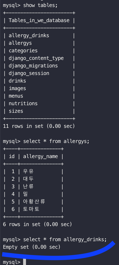 class Allergy(models.Model): allergy_name = models.CharField(max_length=45) name = models.ManyToManyField('Drink', through="Allergy_drink")하지만 이전 FK를 가지고 있는 테이블과 달리