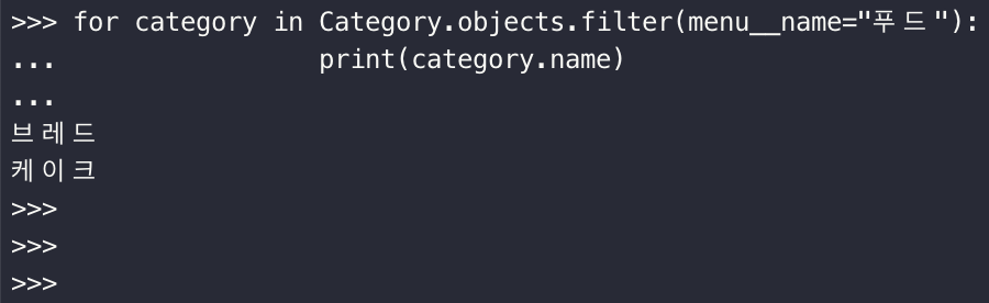 for category in Category.objects.filter(menu__name="푸드"): print(category.name)