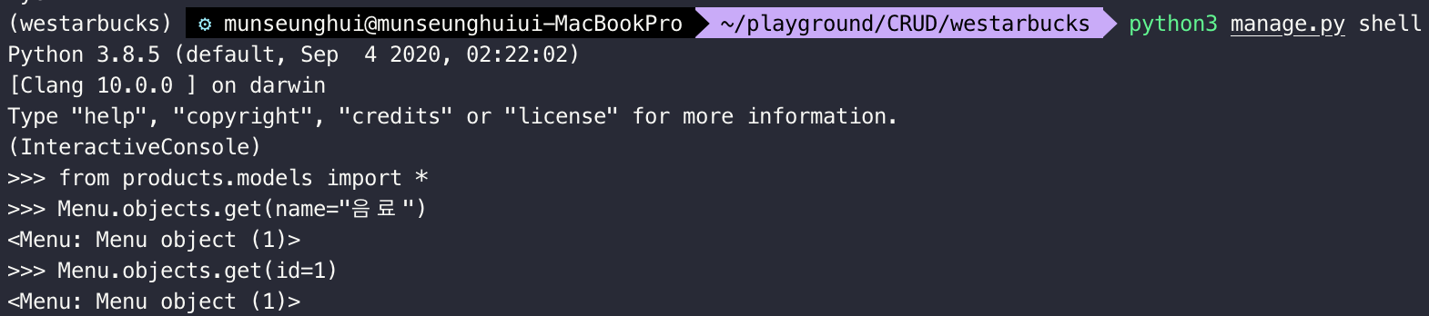 즉, get() method를 이용해 "음료"의 PK를 Read할 수 있다.Menu.objects.get(name="음료") Menu.objects.get(id=1)