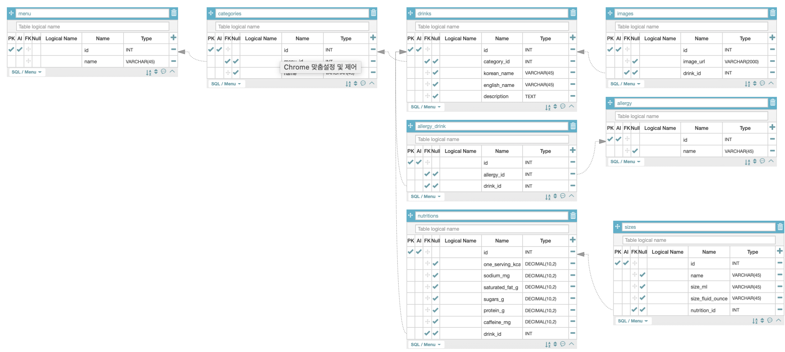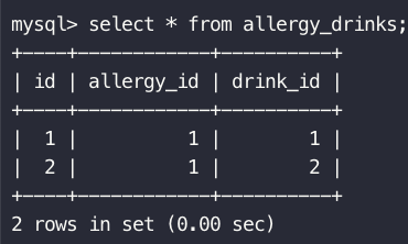아래와 같이 Allergy 테이블은 Drink 테이블과 many to many 관계로