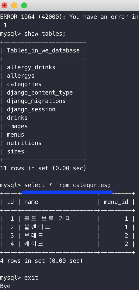 >>> a1 = Menu.objects.get(name="음료") >>> Category.objects.create(name="콜드 브루 커피", menu=a1) >>> Category.objects.create(name="블렌디드", menu=a1) # models.py에 Category 클래스를 정의할때 menu라는 Menu의 FK를 사용하는 변수를 사용함>>> a2 = Menu.objects.get(name="푸드") >>> Category.objects.bulk_create([Category(name="브레드", menu=a2), Category(name="케이크", menu=a2)])이제 Category 테이블을 확인해보자
