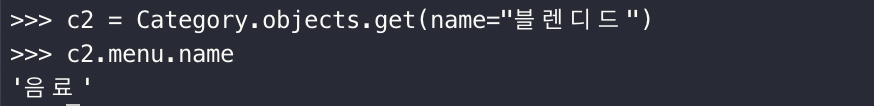 >>> c2 = Category.objects.get(name="블렌디드") >>> c2.menu.name