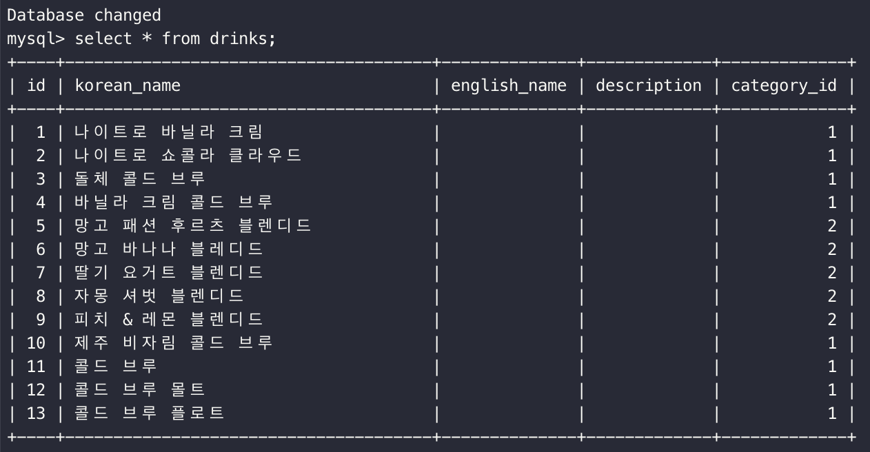 (Drink 테이블은 Category 테이블을 참조하기 때문에 create시 read한 내용을 변수로 넣어 사용하기 위함)