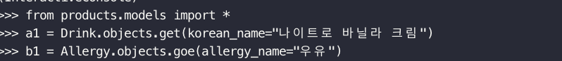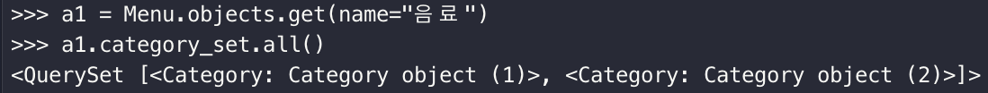 >>> a1 = Menu.objects.get(name="음료") >>> a1.category_set.all()