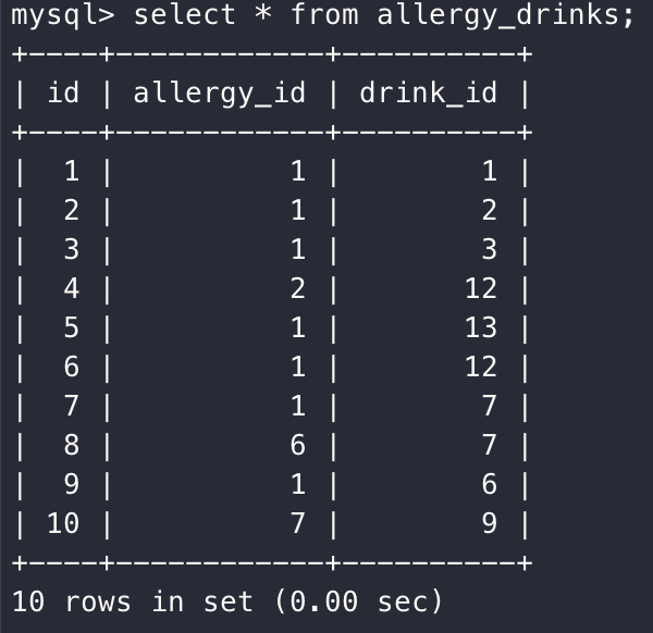 고유의 인스턴스가 없으므로 해당 테이블의 컬럼은 N:N 관계에 있는 Drink 와 Allergy의 PK값으로만 이루어 진다.