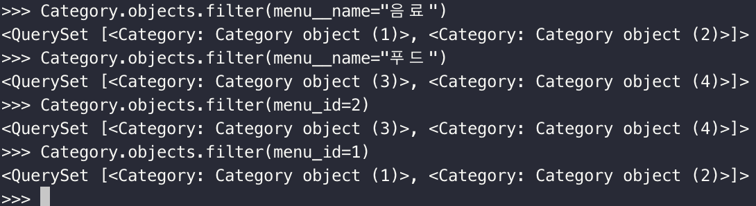 >>> Category.objects.all() >>> Category.objects.filter(menu_id=1) OR Category.objects.filter(menu__name="음료") # (_) 갯수 주의 >>> Category.objects.filter(menu_id=2) OR Category.objects.filter(menu__name="푸드")all()