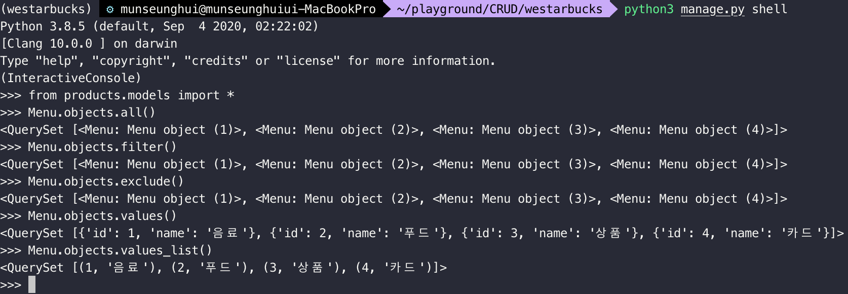 >>> Category.objects.all() >>> Category.objects.filter(menu_id=1) OR Category.objects.filter(menu__name="음료") # (_) 갯수 주의 >>> Category.objects.filter(menu_id=2) OR Category.objects.filter(menu__name="푸드")all()