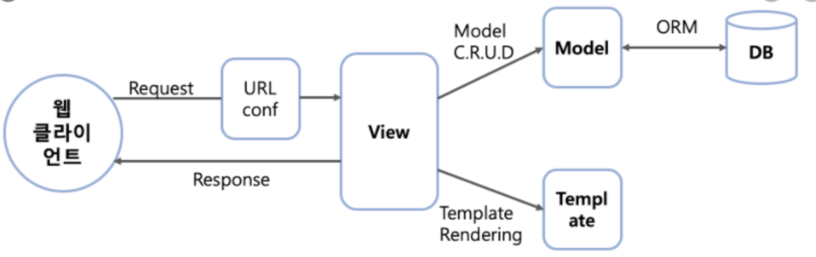출처 : https://wikidocs.net/70649 (점프투장고) 모델 (데이터베이스) 혹은 url --> 뷰 --> 템플릿(HTML)