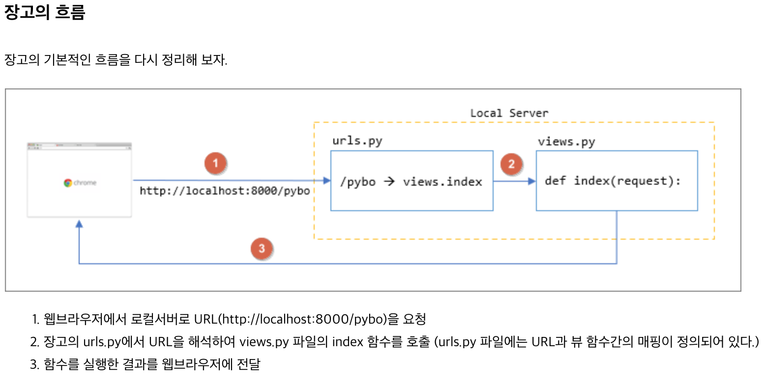 from django.http import HttpResponse #어디 sys에 있겠지...? def index(request): return HttpResponse("Hello, world. You're at the polls index.")index 라는 페이지에 접근하면 사용자는 "Hello ~" 가 표출되는 것을 볼 수 있다 (아래 url 연결이 다 되었을 경우의 이야기이다)