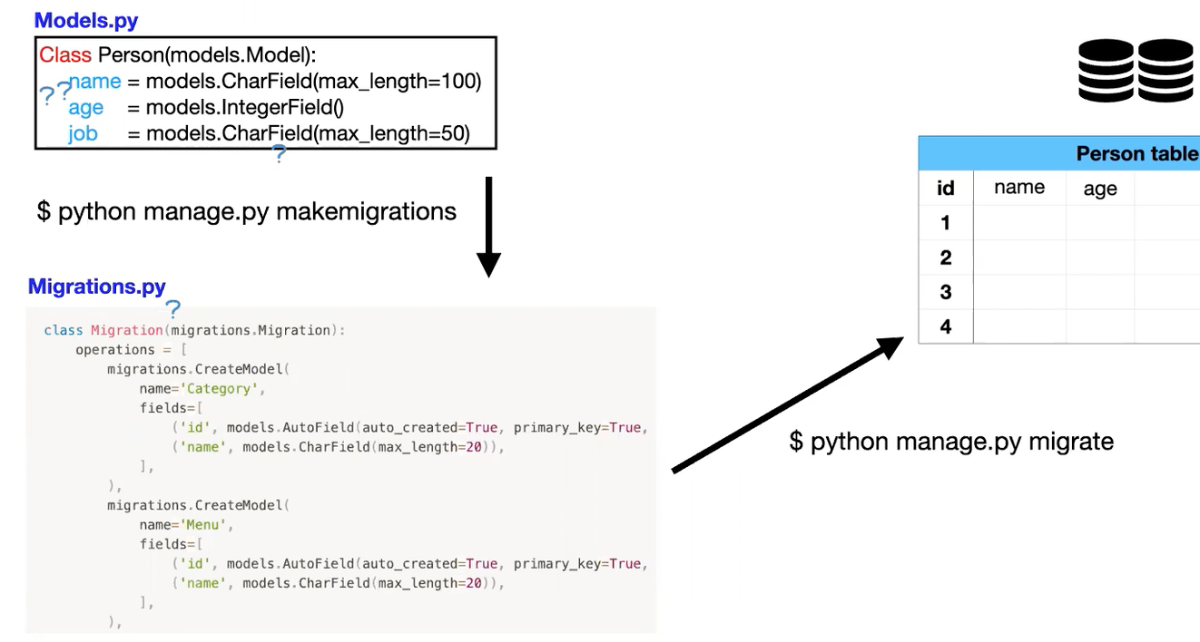 아래 코드들은 models.py의 파이썬 코드를 데이터베이스가 읽을 수 있게 SQL문으로 바꿔준다.