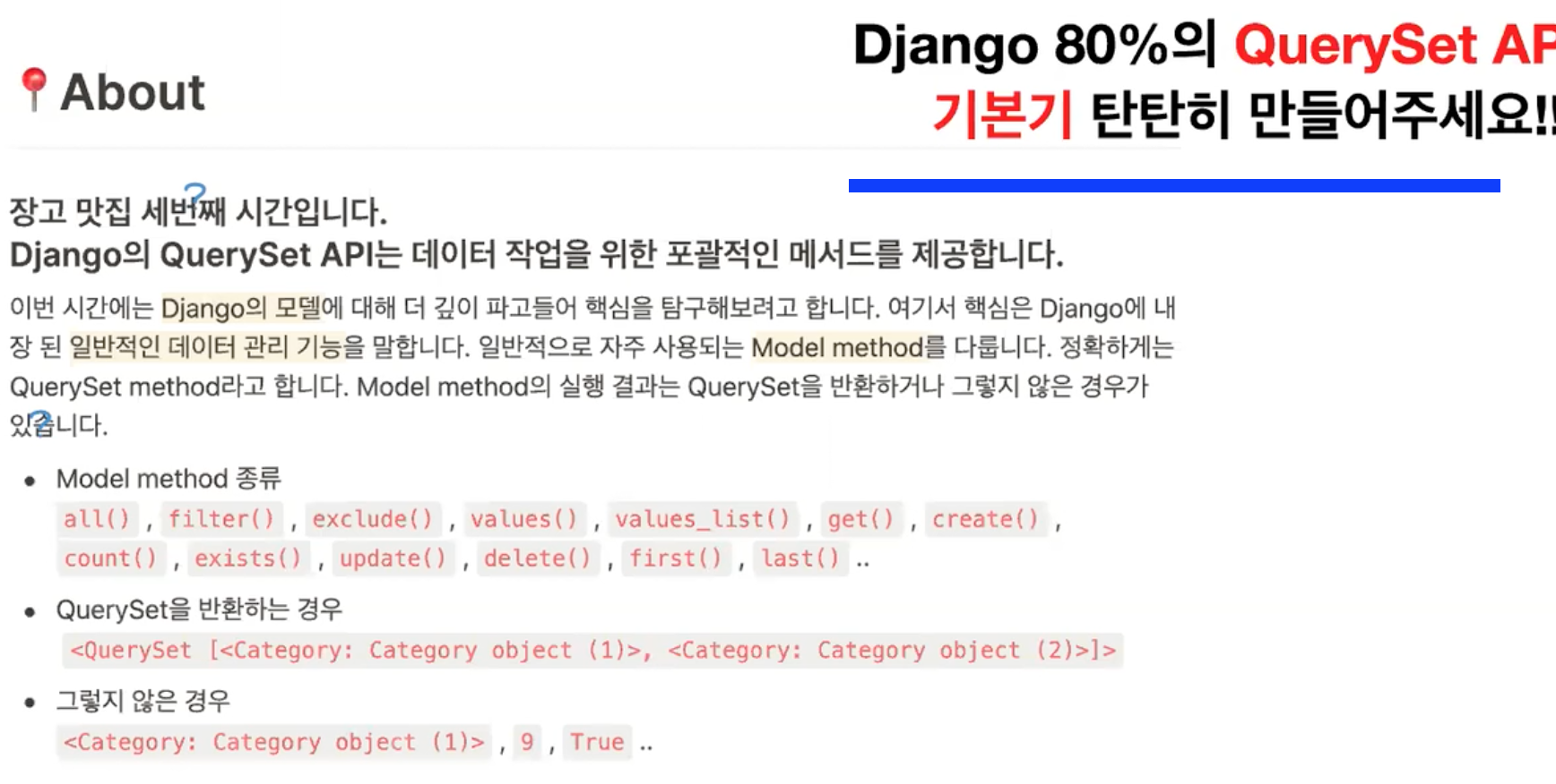 장고에서는 위 메서드와 같은 것들을 QuerySet API라 부른다.