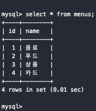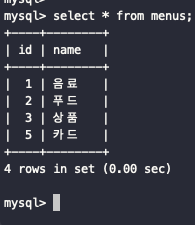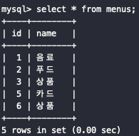 Menu.objects.values_list() <QuerySet [(1, '음료'), (2, '푸드'), (3, '상품'), (5, '카드'), (6, '상품')]># 튜플 형태의 리스트로 반환