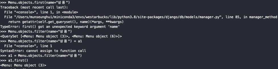 >>> a1 = Menu.objects.filter(name="상품") >>> a1.first() <Menu: Menu object (3)>