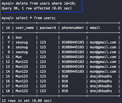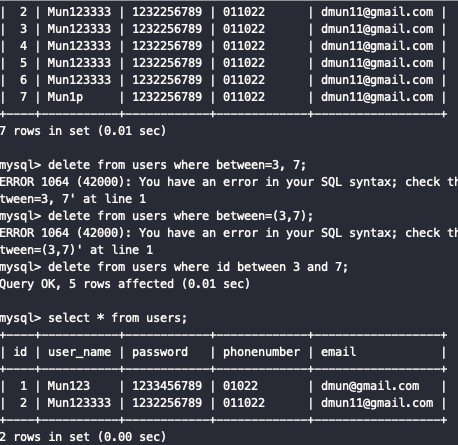 mysql> delete from users where id between 3 and 7;