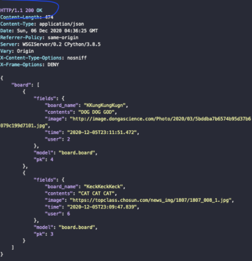 import json from django.http import JsonResponse from django.views import View from django.core.serializers import serialize def get(self, request): try: board_values = Board.objects.all().order_by('-id') # 최신데이터 먼저 get_data = json.loads(serialize('json', board_values)) return JsonResponse({'board' : get_data}) except: return JsonResponse({'MESSAGE' : 'EMPTY_BOARD'}, status=400)데이터베이스에 저장되어있는 게시물 데이터를 python 문법에 따라 메서드를 생성