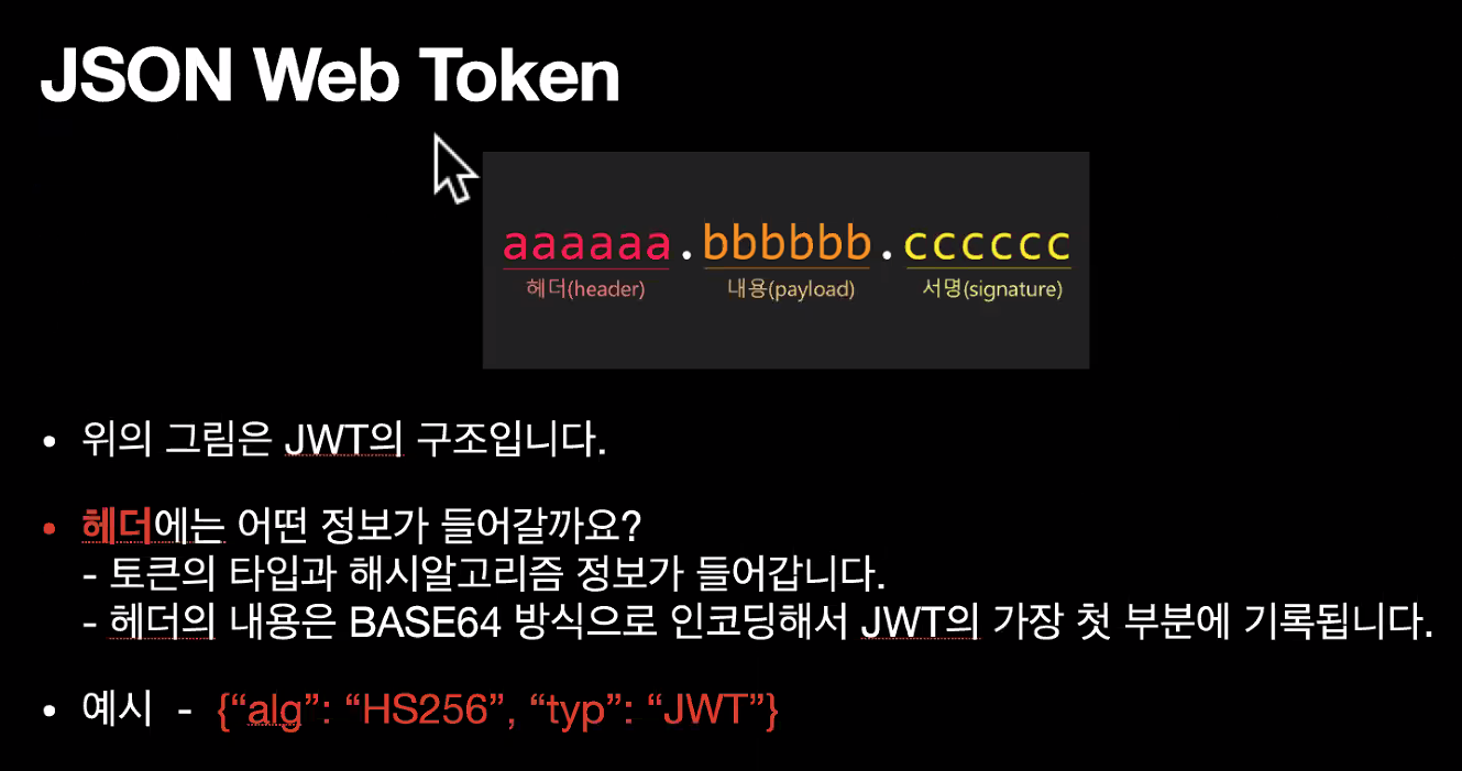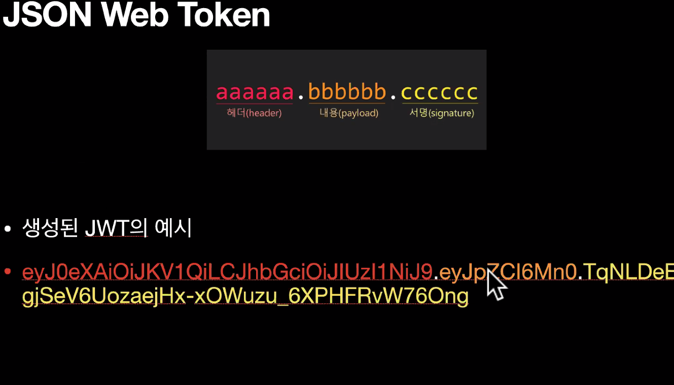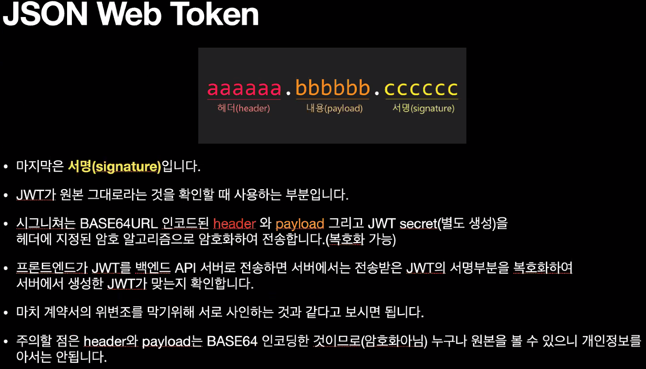 - JWT는 말 그대로 유저 정보를 담음 JSON 데이터를 암호화 해서 클라이언트와 서버간에 주고 받는 것이다.