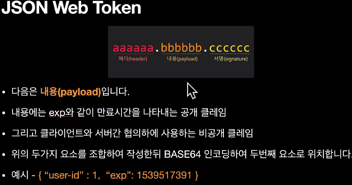 payload 내용 안에는 클라이언트와 서버간의 협의한에 사용하는 비공개 유저정보가 들어간다.