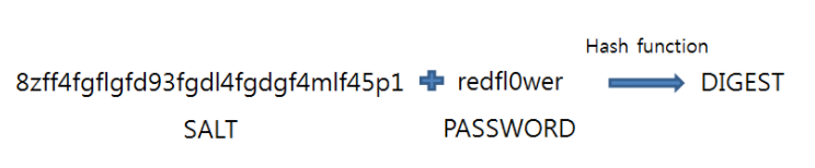 패스워드에 임의의 문자열인 salt를 추가하여 Digest를 생성하는데 salt는 최소 128bit 정도는 되어야 안전하다