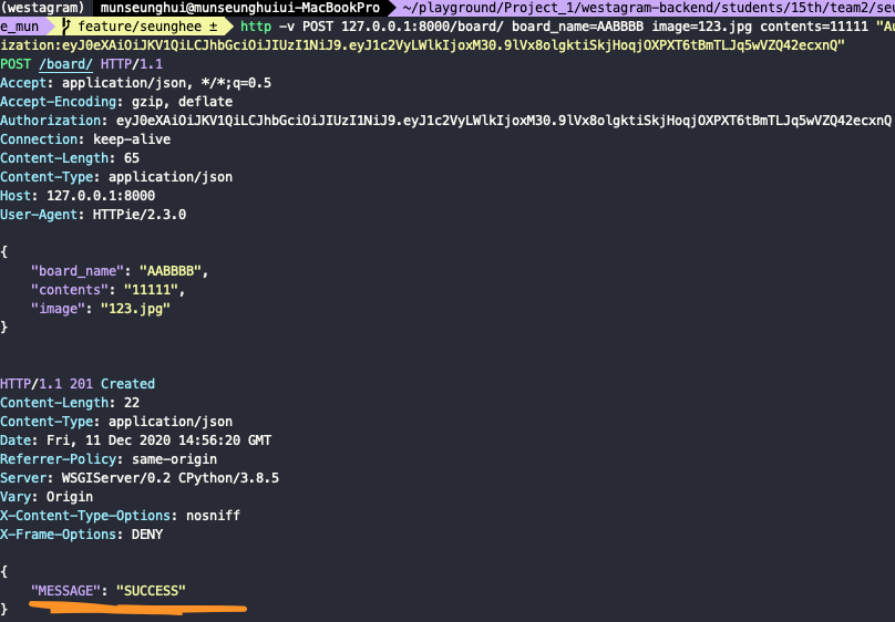 http -v POST 127.0.0.1:8000/board/ board_name=AABBBB image=123.jpg contents=11111 "Authorization:eyJ0eXAiOiJKV1QiLCJhbGciOiJIUzI1NiJ9.eyJ1c2VyLWlkIjoxM30.9lVx8olgktiSkjHoqjOXPXT6tBmTLJq5wVZQ42ecxnQ" # "Authorization: 토큰"