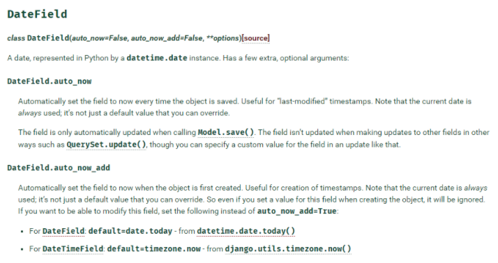 출처 : https://docs.djangoproject.com/en/1.10/ref/models/fields/#django.db.models.DateField - 수정일자 : auto_now=True 사용