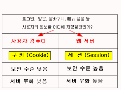 - 저장위치 ( 쿠키 : 클라이언트 // 세션 : 서버)