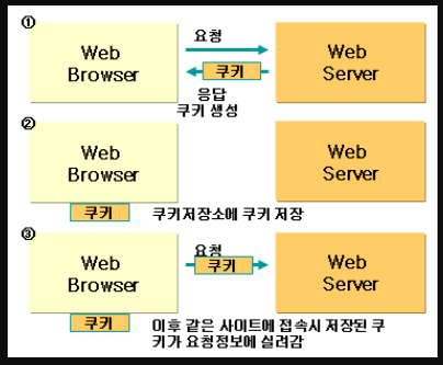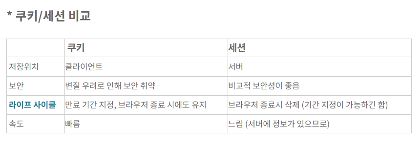 - 라이프 사이클 (쿠키 : 브라우저 종료해도 삭제하기 전까지 남아 있음 // 세션 : 브라우저 종료시 삭제)