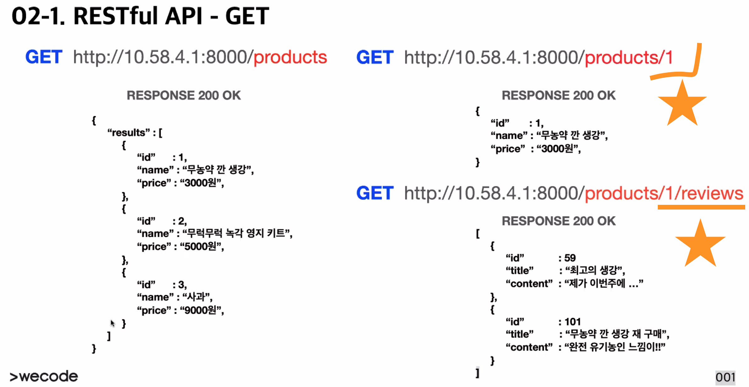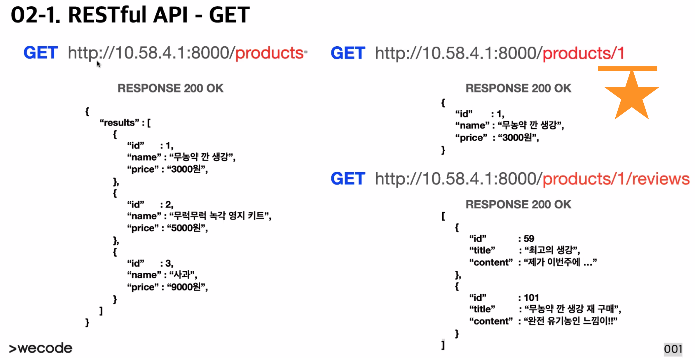 아래 의미는 1번 상품에 달려있는 리뷰를 가져와라는 명령이다.