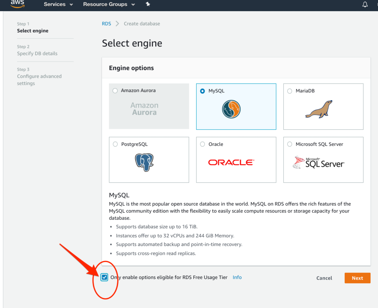 8. MySQL을엔진으로 선택하자. "Only enable iptions eligible for RDS Free Usage Tier" option을 체크해서
