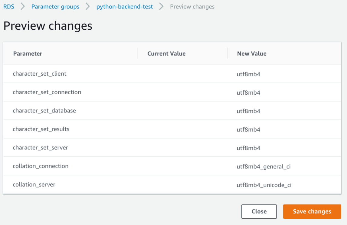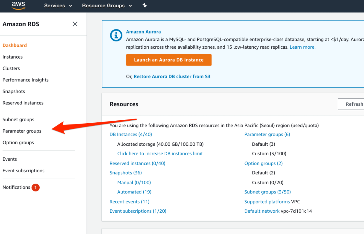 그리고 Database options 세션에 "DB parameter group"을 방금 생성한 파라미터 설정 파일로 변경해주자.