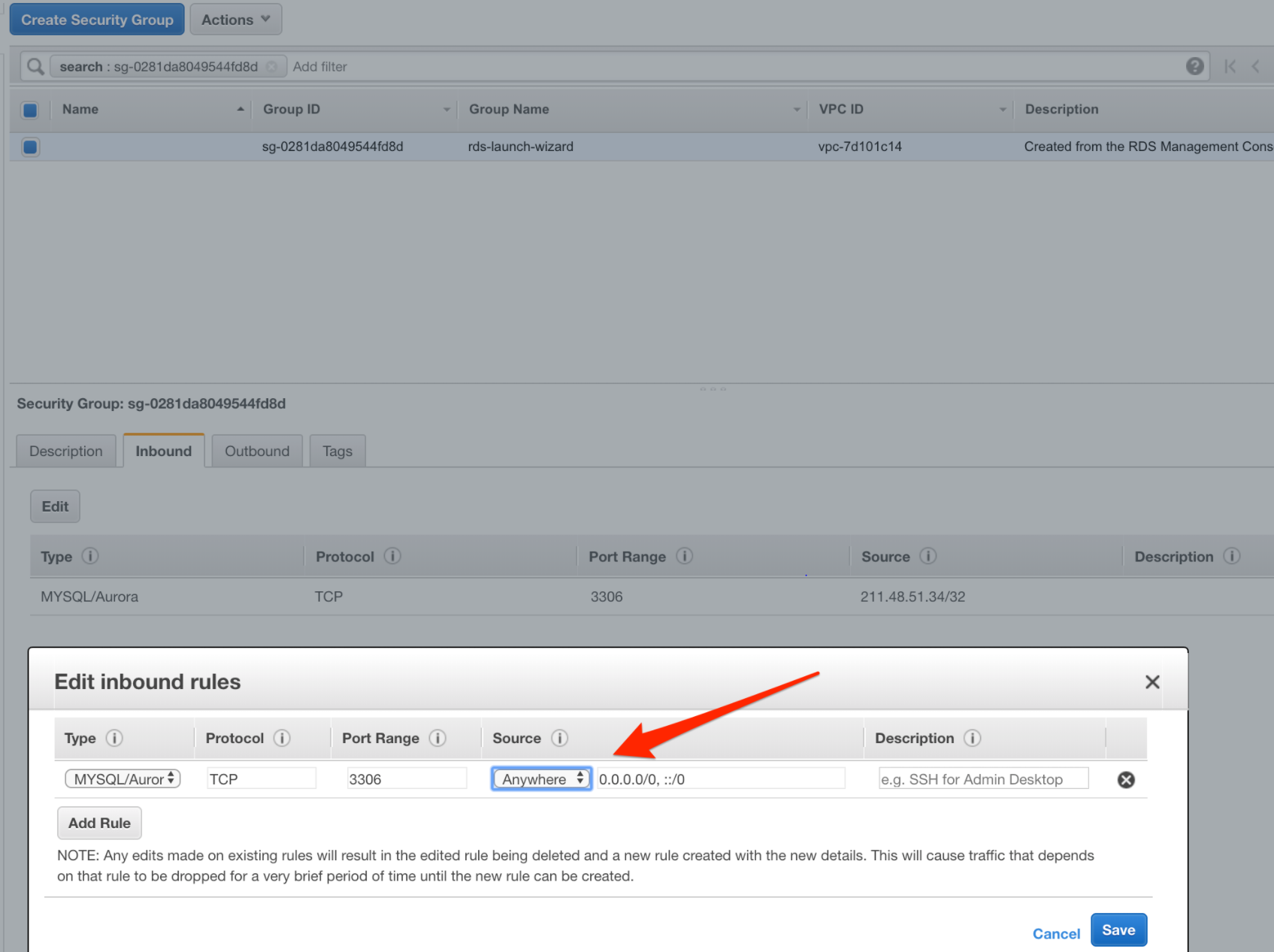 13. Security group 설정을 변경하여 어디서든 접속이 가능하게 하자.
