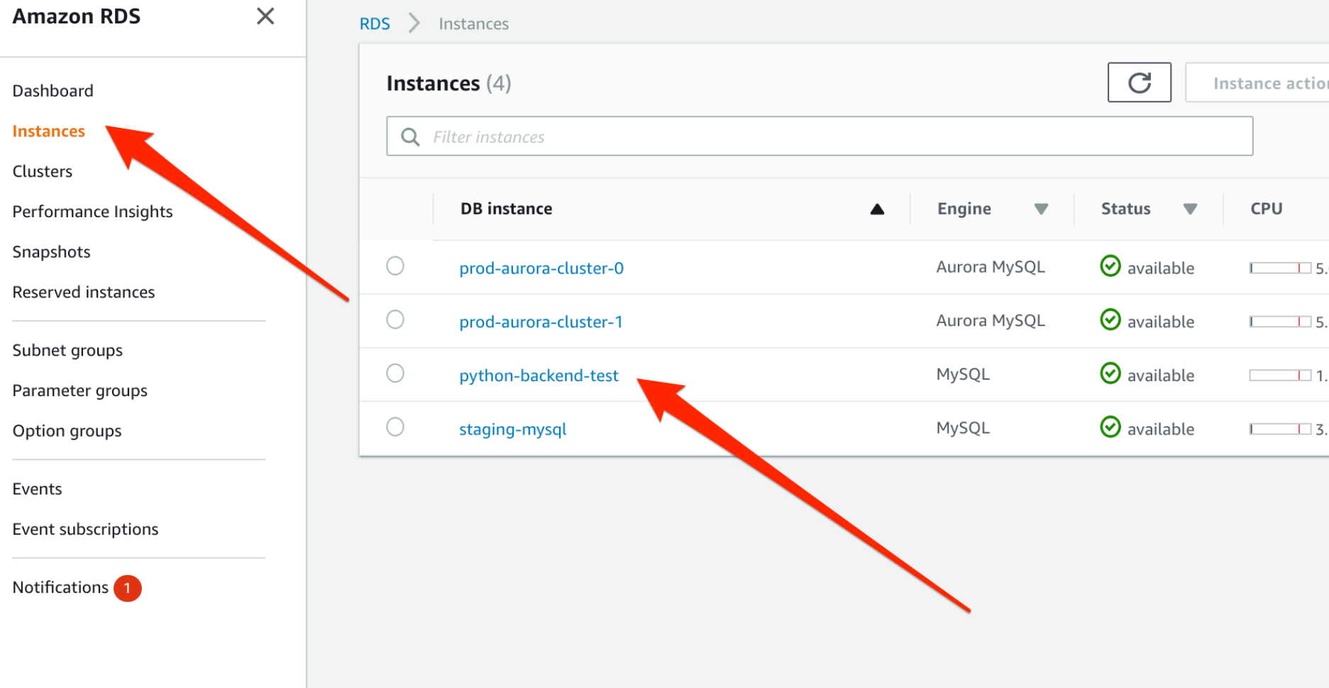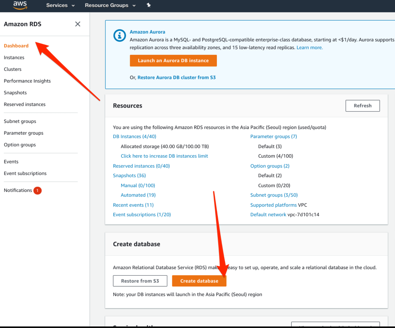 11. 이제 "Instances" 페이지에 가서 방금 생성한 데이터 베이스 대쉬보드 페이지로 가자.