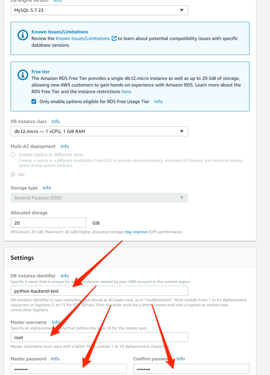 맨 아래 settings 섹션에서 master username과 비밀번호 그리고 데이테베이스 이름만 설정하면 된다.