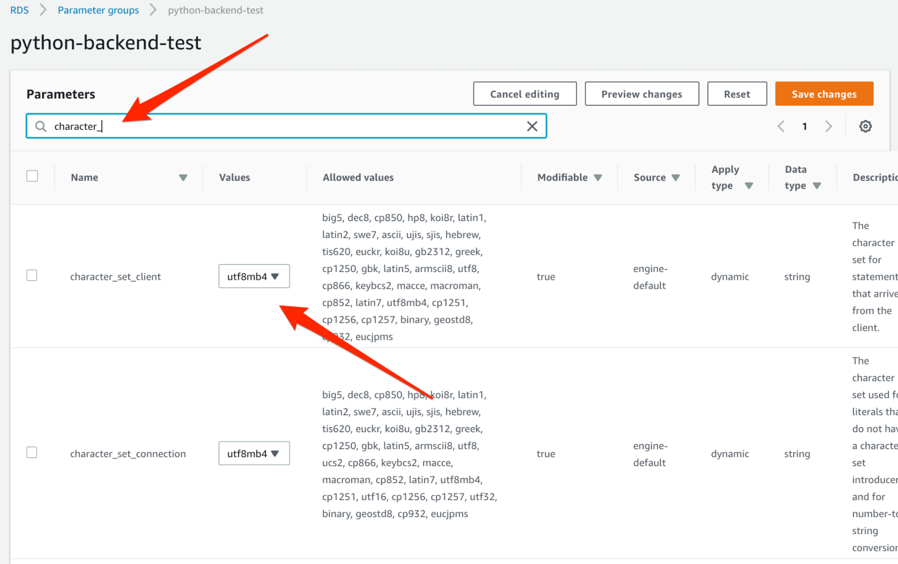 utf-8 인코딩 설정을 해줘야 한국어가 저장 가능하다. 먼저 "Parameters groups" 페이지로 가자.