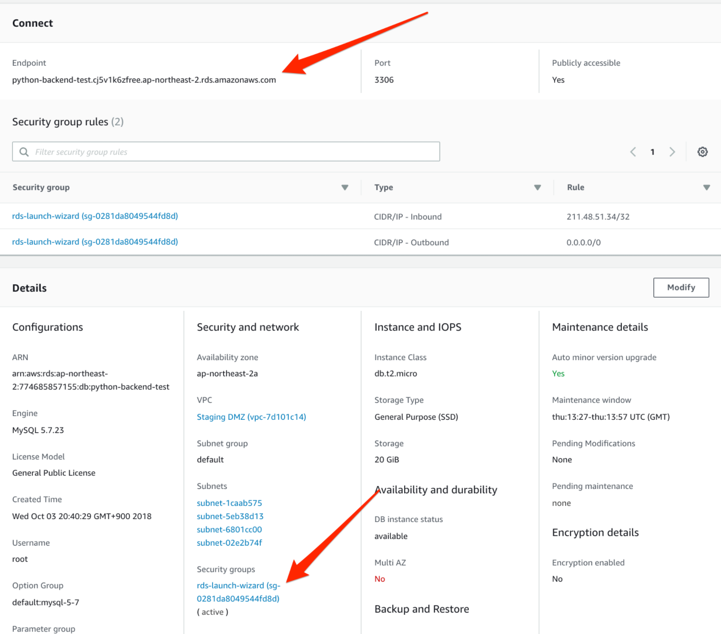 이 주소로 database에 접속 할 수 있다. 그리고 Security groups링크를 클릭하하자.