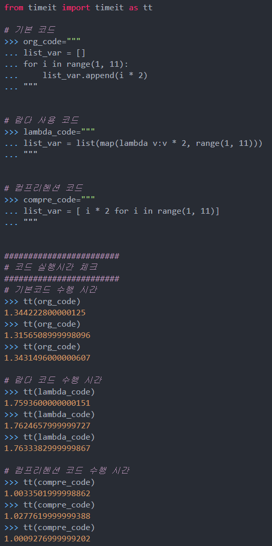 컴프리헨션 문법은 파이썬에서 속도 최적화가 되어있기 때문이라 한다.