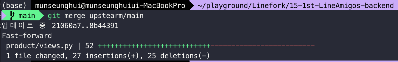 3. upstream repo의 main branch (혹은 원하는 branch도 가능하다고 한다)로부터 local main branch 로 merge 한다.