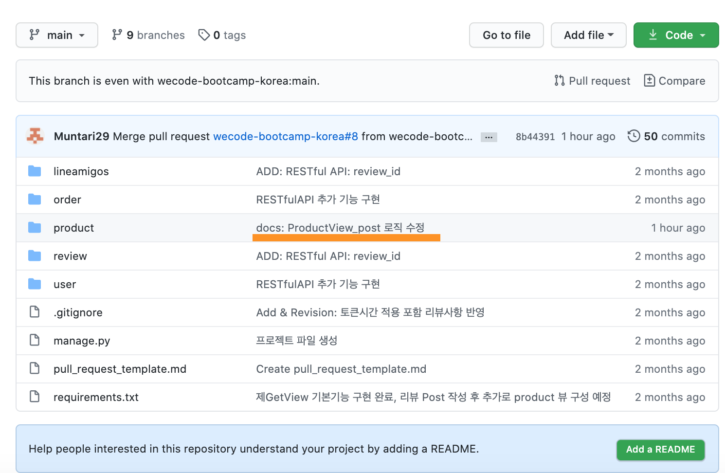 wecode-bootcamp-korea repo에서 내 개인 repo로 포크를 떠와 리팩토링과 기능을 추가하고자 하였다.