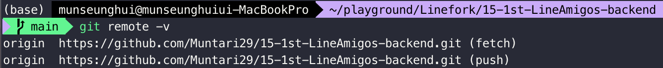 git remote -v아래의 Muntari29 이 현재 포크해온 Repo이다.