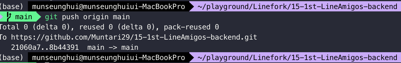 이 과정까지는 local 환경이므로 push 를 통해 remote repo에 적용해주면 된다.