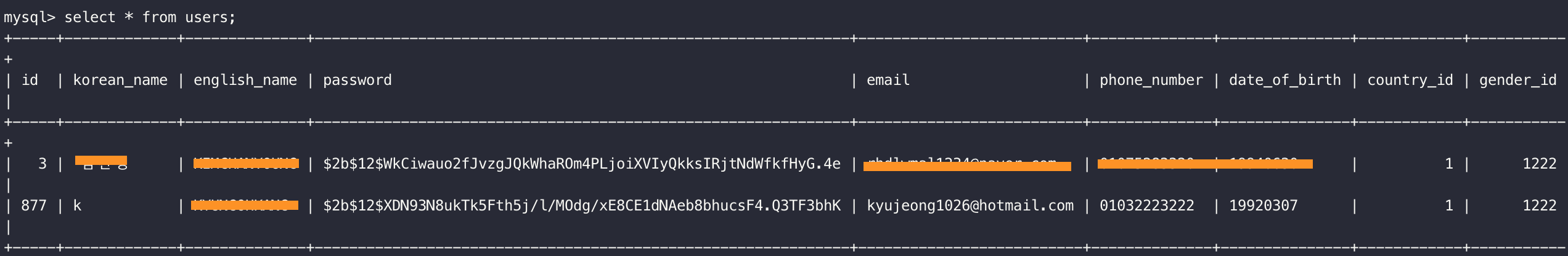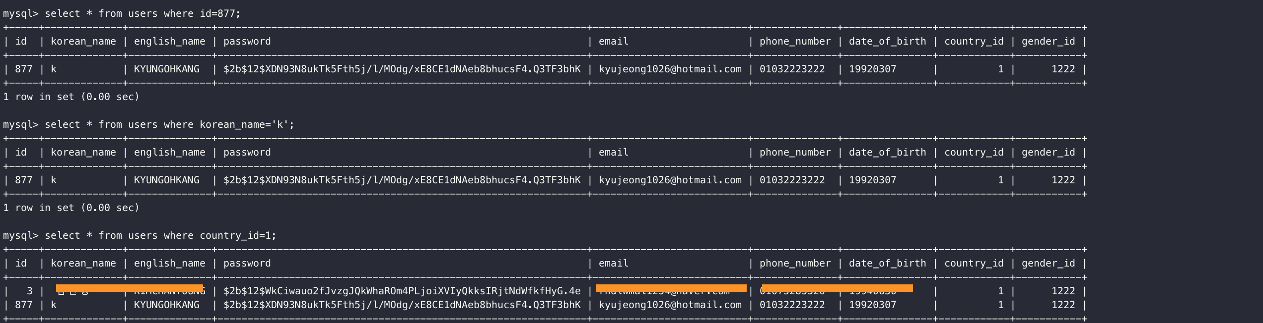 select * from users where id=877; select * from users where korean_name='k'; select * from users where country_id=1;